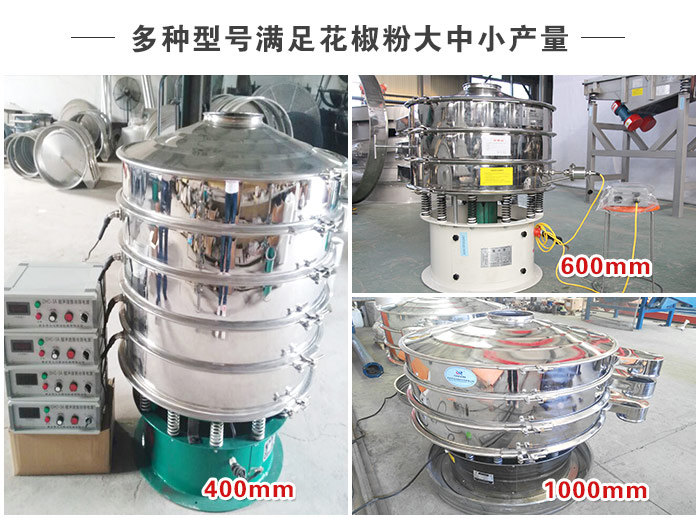 花椒粉除雜振動(dòng)篩的型號(hào)分為直徑400mm、600mm、800mm、1000mm、1200mm、1500mm、1800mm、2000mm等八種標(biāo)準(zhǔn)機(jī)型。