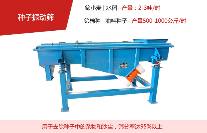 種子振動(dòng)篩主要是去除種子中的雜物和沙塵使用,該機(jī)篩選大豆和玉米每小時(shí)3-5噸,篩選小麥和水稻每小時(shí)2-3噸,篩選棉種和油料種子每小時(shí)500-1000公斤。對(duì)糧食和油料里面的灰塵,碎屑,壞糧及小石子等雜質(zhì),篩分率達(dá)到95%以上。